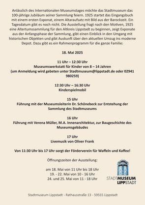 Anlässlich des Internationalen Museumstages möchte das Stadtmuseum das 100-jährige Jubiläum der Sammlung feiern. 1925 startet das Eingangsbuch mit einem ersten Exponat, einem Altaraufsatz mit Bild aus der Barockzeit. Ein Tagesdatum gibt es noch nicht. Die Ausstellung fragt nach den Motiven, 1925 eine Altertumssammlung für den Altkreis Lippstadt zu beginnen, zeigt Exponate aus der Anfangsphase der Sammlung, gibt einen Einblick in den Umgang mit historischen Objekten und gibt Auskunft über den aktuellen Umzug ins moderne Depot. Dazu gibt es ein Rahmenprogramm für die ganze Familie: