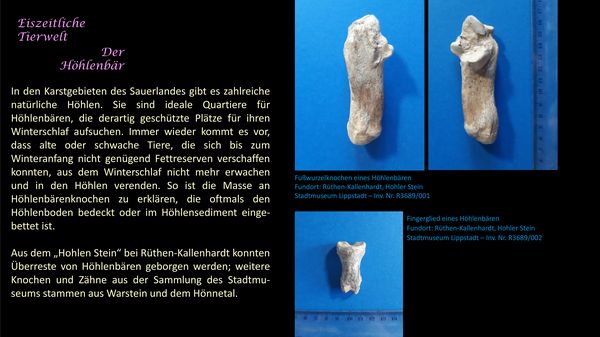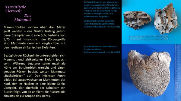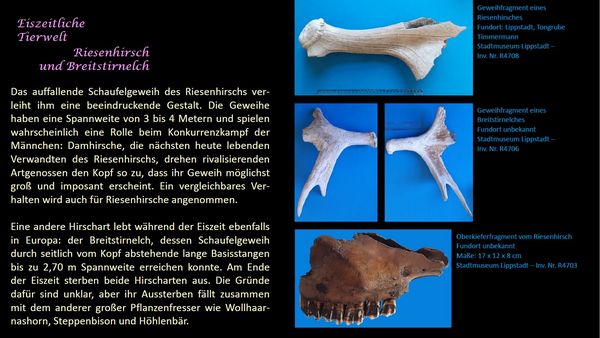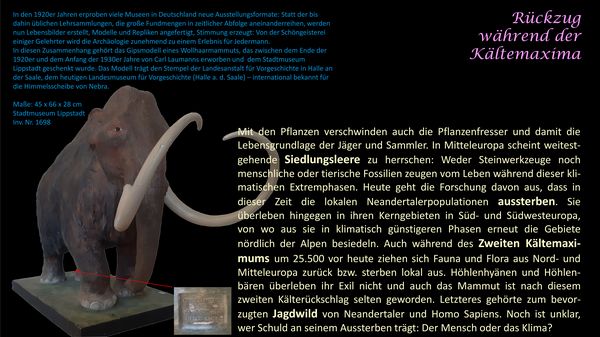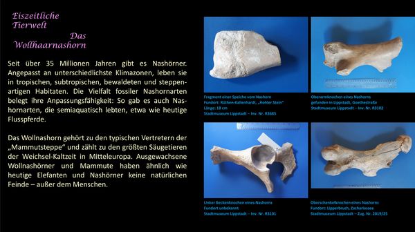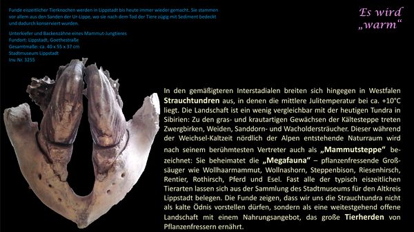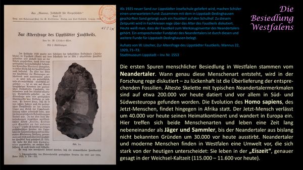 Angefangen von den frühesten Artefakten in der Sammlung des Stadtmuseums begeben wir uns auf eine Zeitreise durch über 100.000 Jahre Menschheitsgeschichte. Die erste Episode wird kalt: Wir treffen uns in der Weichsel-Kaltzeit (115.000 - 11.600 vor heute) und blicken auf das Leben der Neandertaler. Welche Landschaft fanden sie im Altkreis Lippstadt vor? Wovon ernährten sie sich? Wie jagt man eigentlich ein Mammut und was hat es mit den "Anderen" auf sich, die um 40.000 vor heute nach Europa kommen?