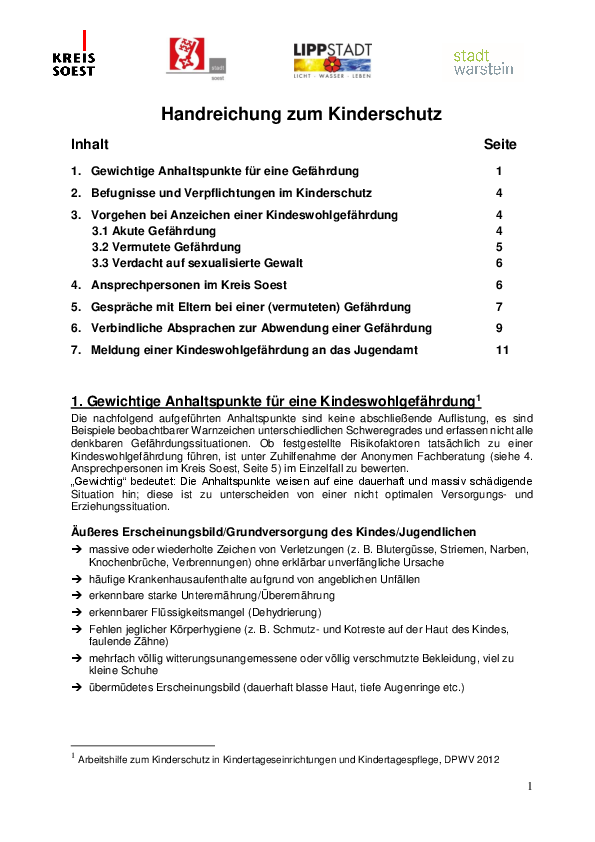 Dennoch kommt es vor, dass Kinder und Jugendliche Vernachlässigung, körperliche, seelische oder auch sexuelle Gewalt erfahren. Es ist Aufgabe des Fachdienstes Jugend und Familie der Stadt Lippstadt die Schutzinteressen der Kinder zu wahren sowie Hilfe und Unterstützung anzubieten. Die Fachkräfte des Kommunalen Sozialdienstes gehen deshalb allen Hinweisen einer möglichen Kindeswohlgefährdung nach. Sie suchen den Kontakt zu den betroffenen Kindern, Jugendlichen und Eltern, um gemeinsam Lösungsmöglichkeiten zu entwickeln.