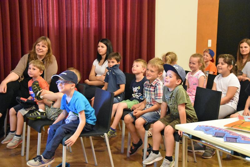 Balduin will sich nämlich einfach nicht verfärben - jedenfalls nicht solange ihm die Lehrerin Frau Sogehtdas nicht erklärt, warum er das machen soll. Auch während der Lesung fragt das kleine Chamäleon Balduin immer wieder nachdem „Warum“ und widerspricht mit lustigen Sprüchen auch ganz gerne seiner Schöpferin Fritzi Bender. Das sorgt für viel Gelächter bei den Kindern. Zum Ende der Lesung lässt Fritzi Bender mit ihren Bauchredekünsten dann nicht nur Balduin sprechen, sondern auch die Lehrerin Frau Sogehtdas zu Wort kommen. Die zeigt dann den anwesenden Kindern ihre lange Chamäleonzunge.