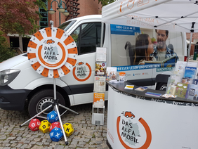 Am ALFA-Mobil informieren die Mitarbeiter des BVAG im Rahmen der Kampagne „Besser lesen und schreiben macht stolz.“ bundesweit zum Thema Analphabetismus in Deutschland. Mit den ALFA-Mobil-Aktionen sollen Betroffene sowohl direkt als auch indirekt über eine breite Öffentlichkeit angesprochen werden. Das Projekt wird gefördert vom Bundesministerium für Bildung und Forschung.
