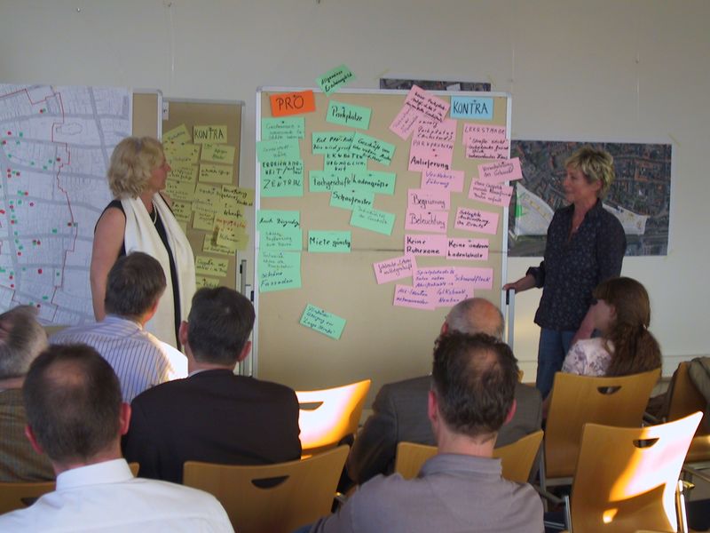 Der Workshop begann mit einem kurzen Überblick von Barbara Thüer, Geschäftsführerin der Lippstadt Marketing GmbH, zu den Rahmenbedingungen, Chancen und Kosten einer ISG in der westlichen Altstadt. Außerdem fasste sie die Ergebnisse der ersten Informationsveranstaltung im März für die Anwesenden noch einmal kurz zusammen. Daran anschleißend präsentierte Yvonne Bleidorn, Studentin der Raumplanung an der Universität Dortmund, die das Lippstädter ISG-Projekt in einer Diplomarbeit begleiten wird, im Rahmen einer „Foto-Safari“ ihren ganz persönlichen Eindruck vom Gebiet der geplanten ISG.