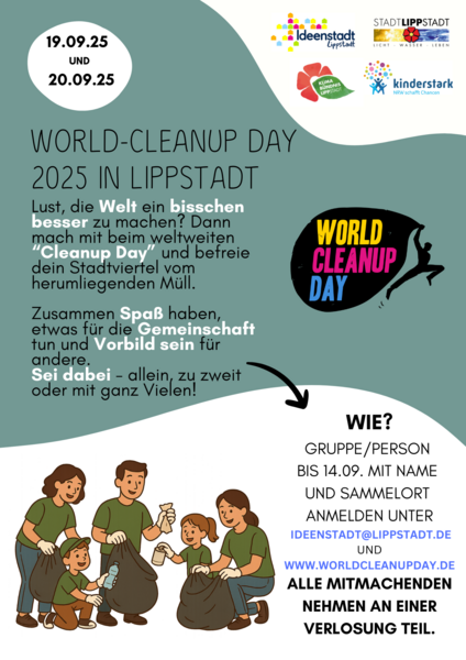 Alle, die Lust haben, am 19. oder 20.09.2025 mit einer Gruppe oder Institution, egal ob Jugendzentrum, Kindergarten, Schule, die eigene Firma oder der private Kegelclub, ein Stückchen Erde vom Müll zu befreien, können sich (möglichst bis zum 14.09.) bei der Stadt Lippstadt unter ideenstadt@lippstadt.de mit Nennung des Gruppennamens und des Sammelortes anmelden und sich auf der deutschlandweiten Seite https://www.worldcleanupday.de/cleanup/aktion_anmelden/ mit einem Gruppenbild und seiner Aktion listen lassen. Alle, die mitmachen, nehmen an einer Verlosung teil.